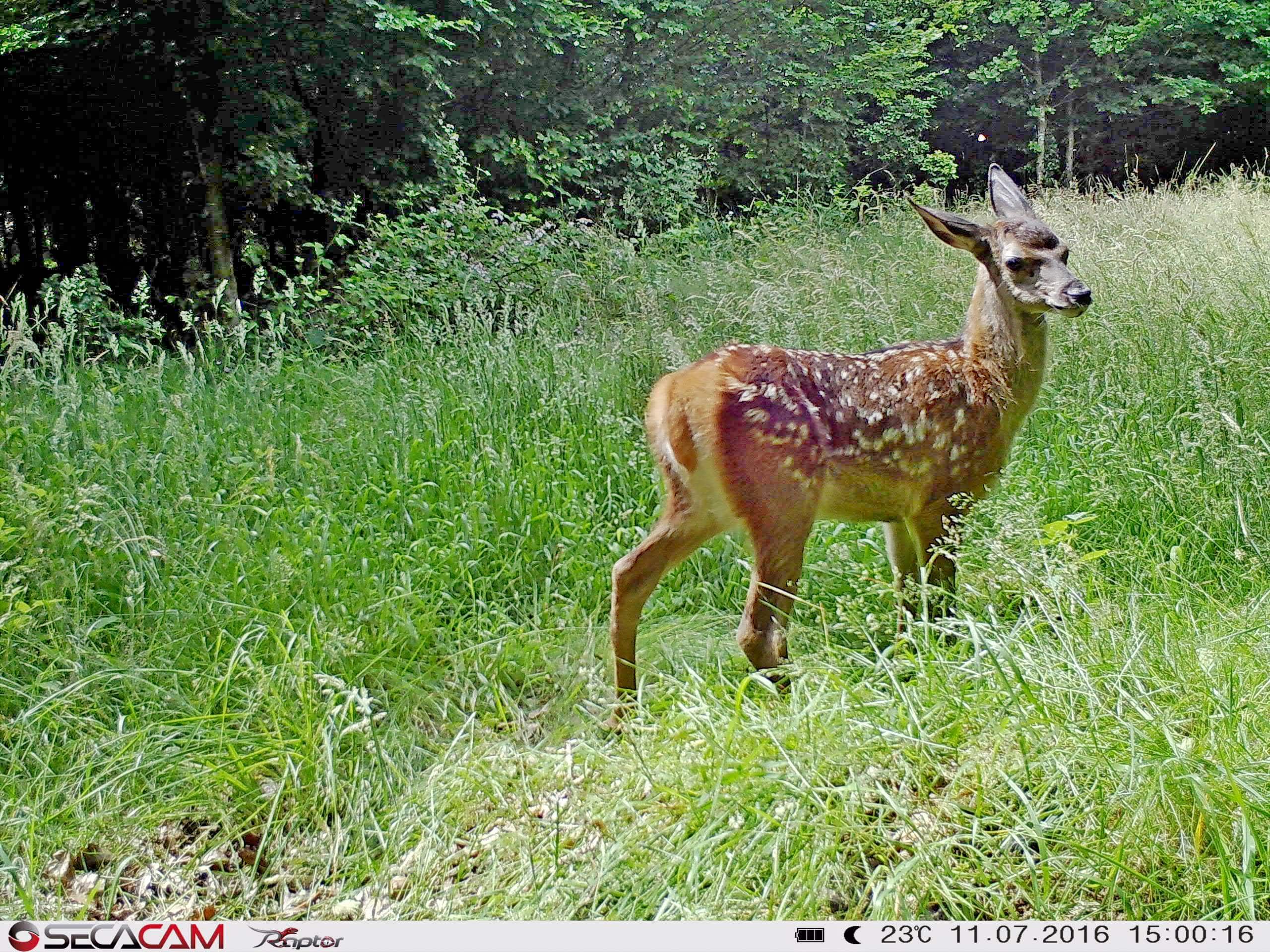 SecaCam Raptor Full HD: Aufbauend auf der bekannten und bewährten Wild Vision flossen in dieses neue Modell einige Weiterentwicklungen ein. Exemplarisch sind insbesondere die Belichtungsautomatik, die kürzeren Verschlusszeiten und die schnellere Auslösung zu nennen. Die Belichtingsautomatik führt dazu, dass Objekte in direkter Nähe nachts nicht überbelichtet (strahlend weiß) werden. Die kurzen Verschlusszeiten führen zu mehr Bewegungsschärfe am Tag und insbesondere bei Nacht. Und durch die schnellere Auslösung von gerade einmal 0,4 Sekunden, erwacht die SecaCam Raptor unfassbar schnell aus dem StandBy und erwischt selbst Vögel im Flug. Wenn man einen definierten Bereich überwachen möchte, garantiert die SecaCam Raptor mit ihrem Standard-Bildausschnitt beste Bildqualität. Ein Beispiel aus unserem Wald ist das Rehkitz, bei dem jede Wimper zu erkennen ist.