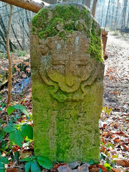 Historischer kurkölnischer Grenzstein von 1734 an der Venner Allee (ehem. Jagdschneise) Grüner Weg im Kottenforst bei Bonn – Foto: Wald-Prinz