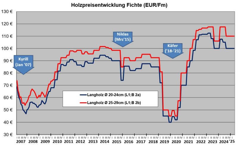 Wichtig: die in der u.a. Grafik dokumentierten Holzpreise beziehen sich auf gesundes Holz. Käferholz wird mit einem Abschlag (s.u.) belegt. Stand Q1 2025.